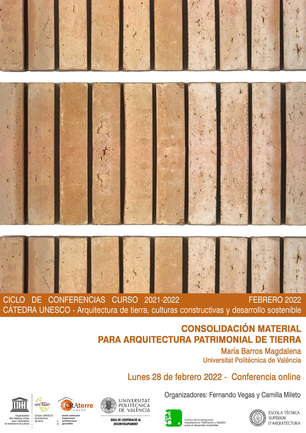 Desde la Cátedra UNESCO de Arquitectura de tierra, culturas constructivas y desarrollo sostenible os enviamos la información de nuestra próxima conferencia. Igual que las anteriores, estará disponible próximamente en nuestro Canal de Youtube.