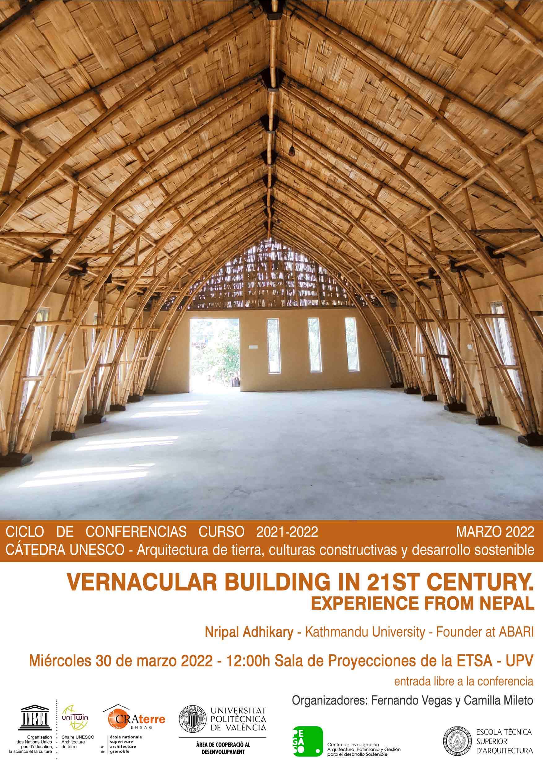 The conference’s title is “Vernacular building in 21st century. Experience from Nepal” by Nripal Adhikary (Kathmandu University – ABARI). It will take place on Wednesday March 30th 2022, at 12:00h, in the Sala de Proyecciones of the Escuela Técnica Superior de Arquitectura – Universitat Politècnica de València.