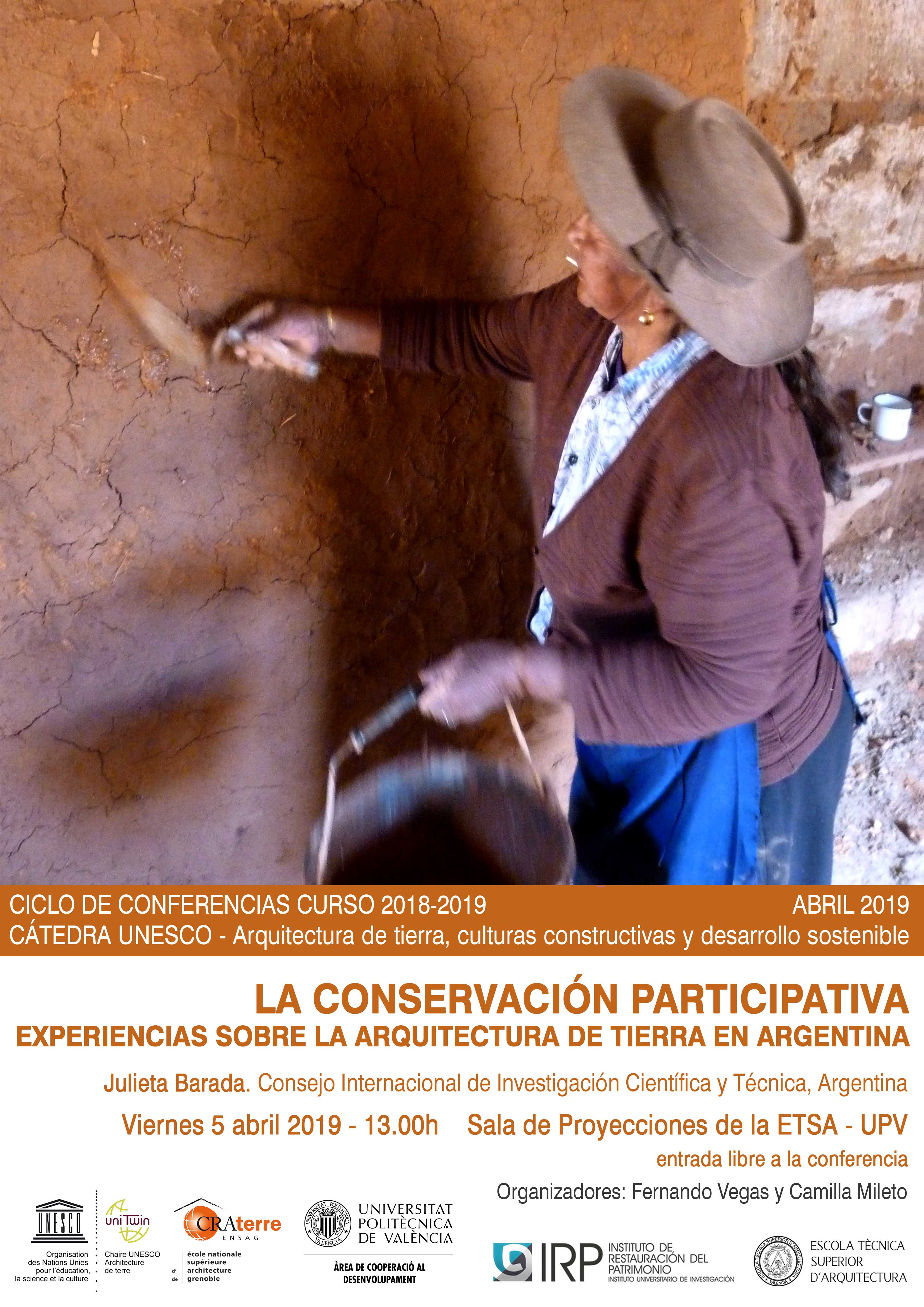 The conference’s title is “La conservación participativa: experiencias sobre la arquitectura de tierra en Argentina” by Julieta Barada from the Consejo internacional de Investigación Científica y Técnica de Argentina. It will take place next Friday April 5th 2019, 13:00h, at the Sala de Proyecciones in the Escuela Técnica Superior de Arquitectura de la Universitat Politècnica de València.