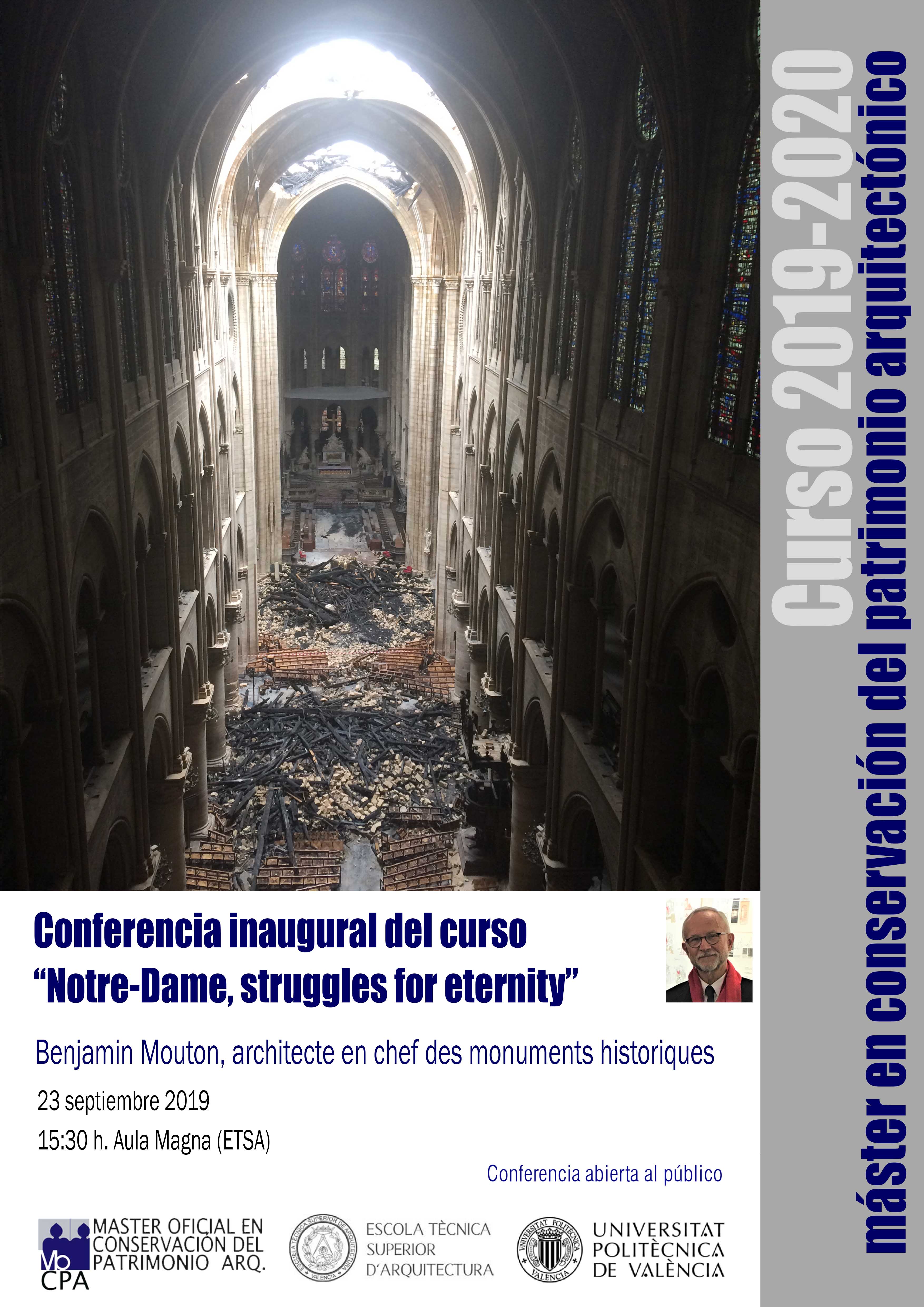 The conference’s title is “Notre-Dame, struggles for eternity” by Benjamin Mouton, architecte en chef des monuments historiques (France). It will take place on Monday September 23th 2019, at 15:30h, in the Aula Magna of the Escuela Técnica Superior de Arquitectura – Universitat Politècnica de València.