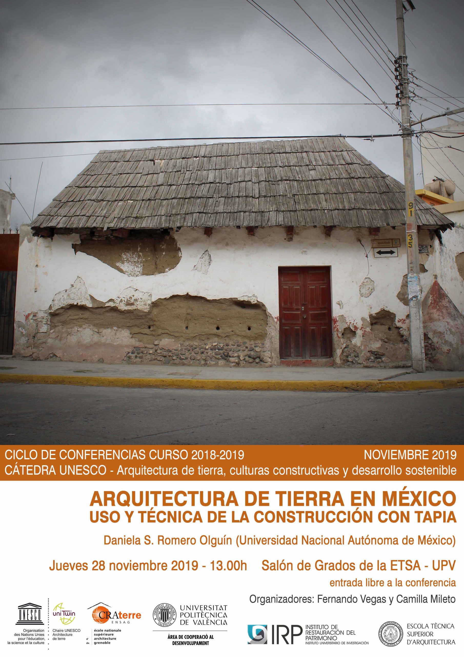 The conference’s title is ““Arquitectura de tierra en México: uso y técnicas de la construcción con tapia” by Daniela S. Romero Olguín. It will take place on Thursday November 28th 2019, at 13:00h, in the Salón de Grados of the Escuela Técnica Superior de Arquitectura – Universitat Politècnica de València.