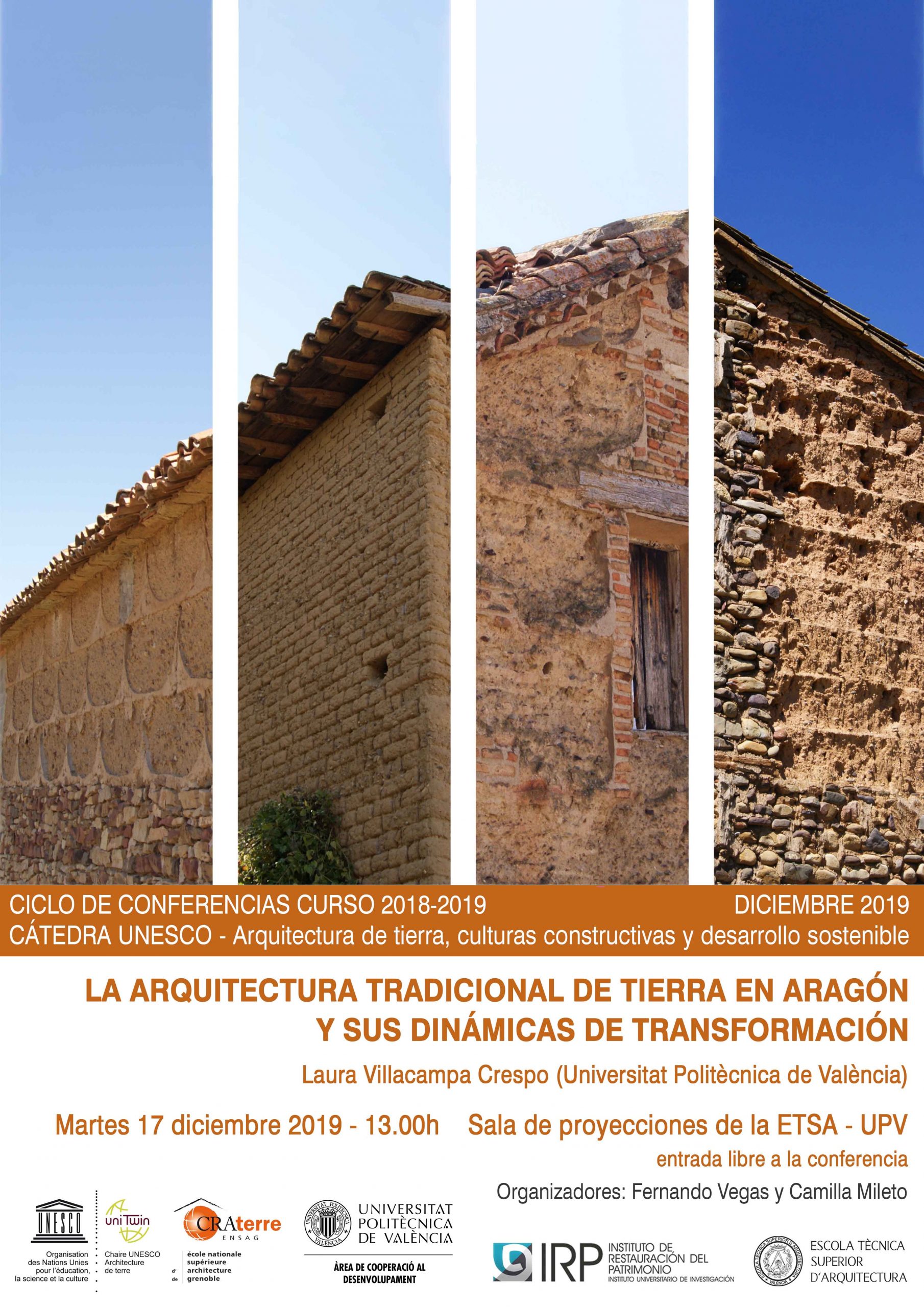 The conference’s title is “La arquitectura tradicional de tierra en Aragón y sus dinámicas de transformación” by Laura Villacampa Crespo. It will take place on Tuesday Decembrer 17th 2019, at 13:00h, in the Sala de Proyecciones of the Escuela Técnica Superior de Arquitectura – Universitat Politècnica de València.