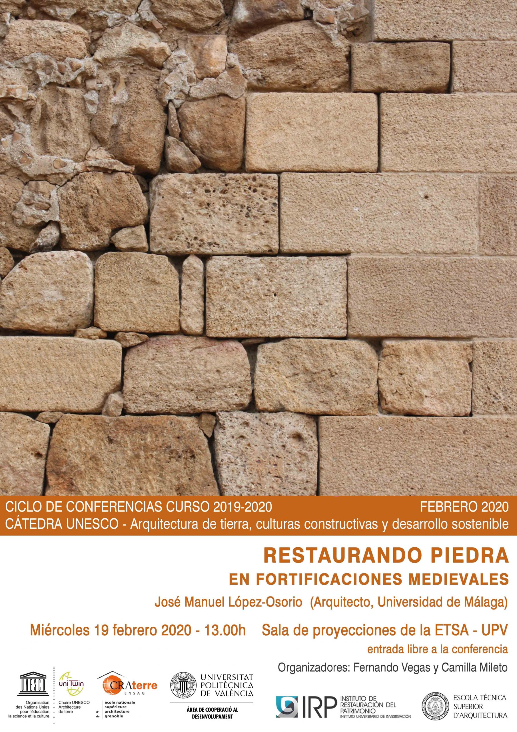 The conference’s title is  “Restaurando piedra en fortificaciones medievales”   by José Manuel López-Osorio (University of Málaga).  It will take place on Wednesday February 19th 2020, at 13:00h, in the Sala de Proyecciones of the Escuela Técnica Superior de Arquitectura – Universitat Politècnica de València.