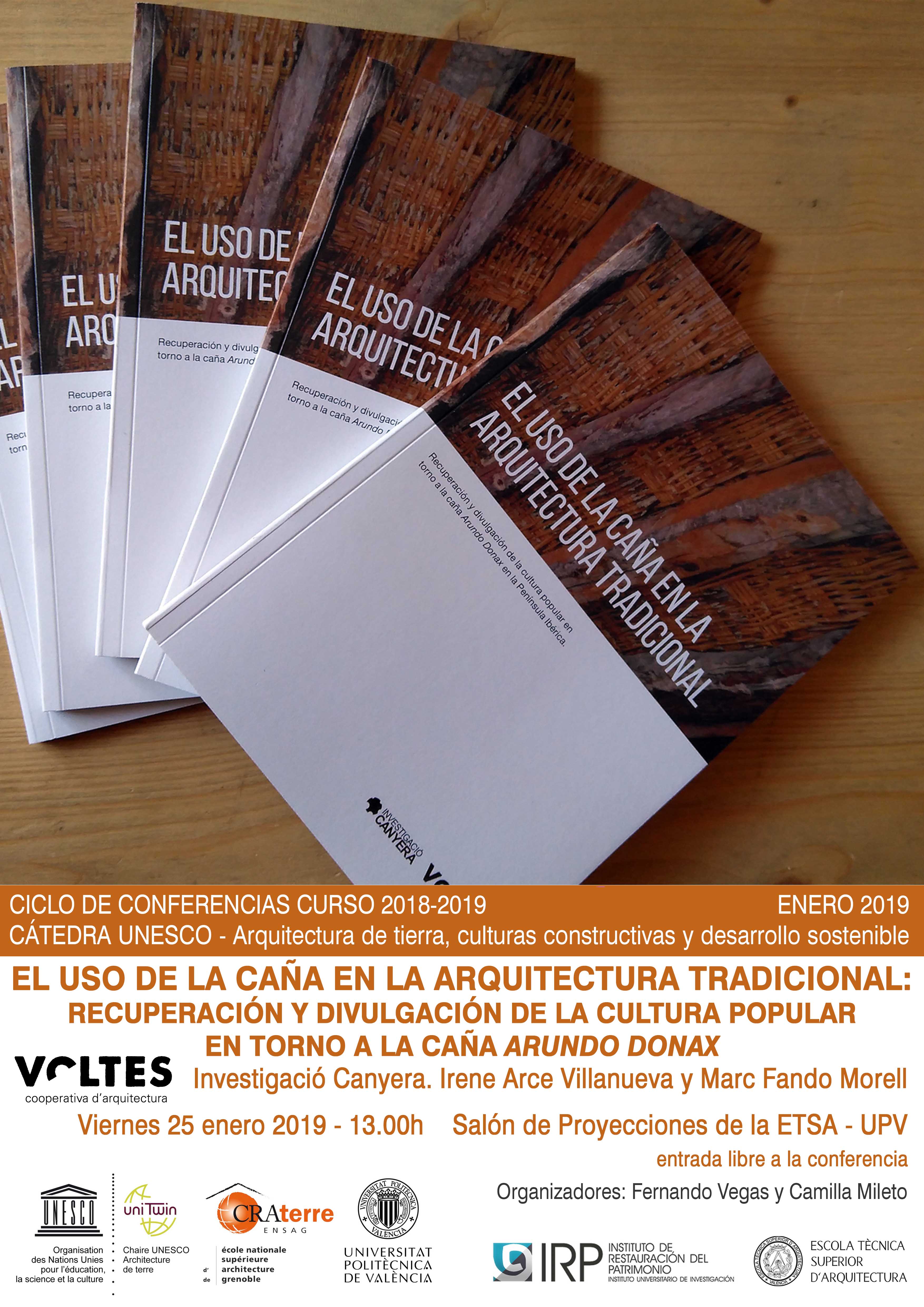 The conference’s title is “El uso de la caña en la arquitectura tradicional: recuperación y divulgación de la cultura popular en torno a la caña Arundo Donax” by Irene Arce Villanueva and Marc Fando Morell, from Investigació Canyera. It will take place next Friday January 25th 2019, 13:00, at Sala de Proyecciones in the Escuela Técnica Superior de Arquitectura de la Universitat Politècnica de València.